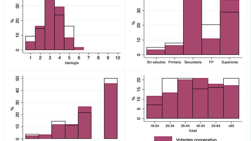 En lo que respecta a los niveles de educación vemos que la distribución entre un grupo y otro de votantes es también similar. La única diferencia que salta a la vista es que entre los votantes NO cooperativos hay, en términos relativos, un mayor porcentaje con niveles medios de formación (FP) y menor porcentaje con estudios secundarios o superiores. Estas diferencias tampoco son relevantes desde el punto de vista estadístico.