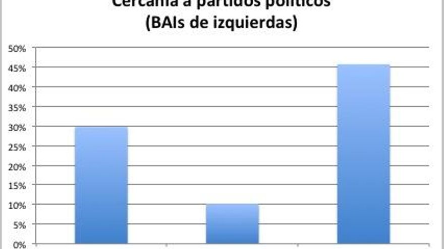 Este espacio parece todavía más relevante si analizamos por qué partido sienten más simpatía o consideran más cercano a sus ideas los BAIs de izquierdas. En el gráfico 2, muestro que un 45% no se considera cercano a ninguno de los partidos. Es decir, casi la mitad de los desmovilizados en la izquierda se sienten huérfanos de opción política. Además, entre los que sí se consideran cercanos a algún partido político, un 30% lo son del PSOE, y apenas un 10% se siente cercano a Izquierda Unida. Existe, por tanto, una bolsa relevante de BAIs en la izquierda que no parece probable que vaya a votar Izquierda Unida. Estos datos indicarían que IU está cerca de su techo en cuanto a atracción de votantes desmovilizados o indecisos en la izquierda y que existe un espacio electoral para nuevas iniciativas que movilicen a estos ciudadanos.