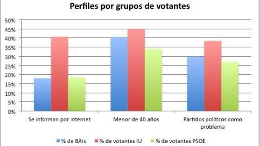En el gráfico 3 muestro los porcentajes dentro de los tres grupos (BAIs, ciudadanos que votarían mañana a IU y ciudadanos que votarían mañana al PSOE) que responden a estos rasgos. Se puede comprobar que el votante de Izquierda Unida ya responde a este perfil. Únicamente en términos de edad, los BAIs e IU son algo parecidos. Un 40% de los BAIs de izquierdas son gente joven (medida aquí como menor de 40 años), mientras que en Izquierda Unida el porcentaje alcanza el 45%. En los otros dos perfiles, los votantes de Izquierda Unida son el grupo que claramente ya contienen votantes con estas características, Más de un 40% de sus votantes utiliza internet (tres o más días a la semana) para obtener información sobre política o sociedad. Entre los BAIs, el porcentaje es apenas del 15%, ligeramente por debajo que en el PSOE. Igualmente, casi el 40% de los votantes de IU consideran a los partidos políticos y la clase política entre los tres mayores problemas de este país. Entre los BAIs el porcentaje es de un 30%. Este análisis de los perfiles haría pensar que gran parte del electorado potencial de Podemos ya se encuentra dentro del electorado de Izquierda Unida y que competirían por muchos de los mismos votos.
