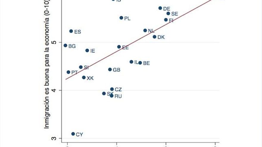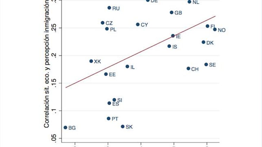 Gráfico 1. Relación entre percpeción de la situación económica y del impacto de la inmigración en la economía (medias nacionales). Fuente: Encuesta Social Europea 2012.