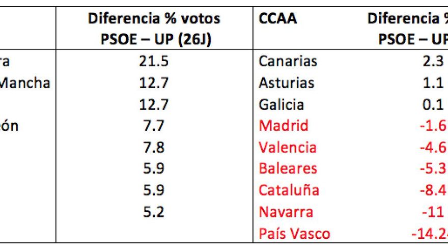 En Canarias y Aragón, a pesar de estar por encima del 20%, las potenciales fugas no son tan elevadas como en Cataluña y Navarra, pero estrecharían el margen electoral entre el PSOE y Podemos. Aunque en ambas CCAA los socialistas hayan mantenido la ventaja el 26J, ésta es bastante estrecha (2 y 5 puntos respectivamente). Lo contrario a lo que sucede en las dos Castillas: a pesar de que el riesgo de fuga hacia Podemos está apenas por encima de la media, la ventaja electoral del PSOE en estas CCAA es amplia. Aún no les aprieta el cuello (12.7 puntos en Castilla La Mancha y 7.7 puntos en Castilla y León).