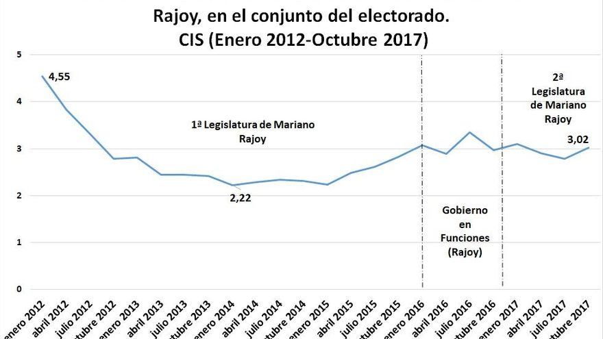 De acuerdo con los últimos datos deI CIS disponibles (barómetro con indicadores de valoración política y voto, realizado el pasado mes de octubre), casi el 80% de los ciudadanos desconfía de Rajoy, frente a un 20% que confía en él. Se trata de una elevada cifra de desconfianza que, no obstante, podría ser matizada si se tiene en cuenta que Pedro Sánchez, como principal líder de la oposición, suscita (aún) más desconfianza (83%) que Rajoy.
