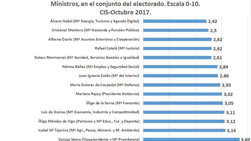 Respecto a los miembros de su Gobierno, encontramos que Rajoy está peor valorado que cinco (Soraya Sáenz de Santamaría, Isabel García Tejerina, Íñigo Méndez de Vigo, Luis de Guindos e Íñigo de la Serna) de sus trece Ministros. Si bien es cierto, que ningún ministro consigue el aprobado de los ciudadanos y todos, sin excepción, reciben una nota media inferior a 4 (ver gráfico 1).