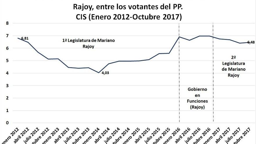 Si bien, desde enero de 2016, y aunque con altibajos, la valoración de Rajoy ha mejorado entre los votantes del PP y ahora, su nivel de popularidad (6,48) es similar al que tenía al inicio de su primer mandato (6,81), entre estos votantes.