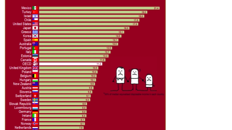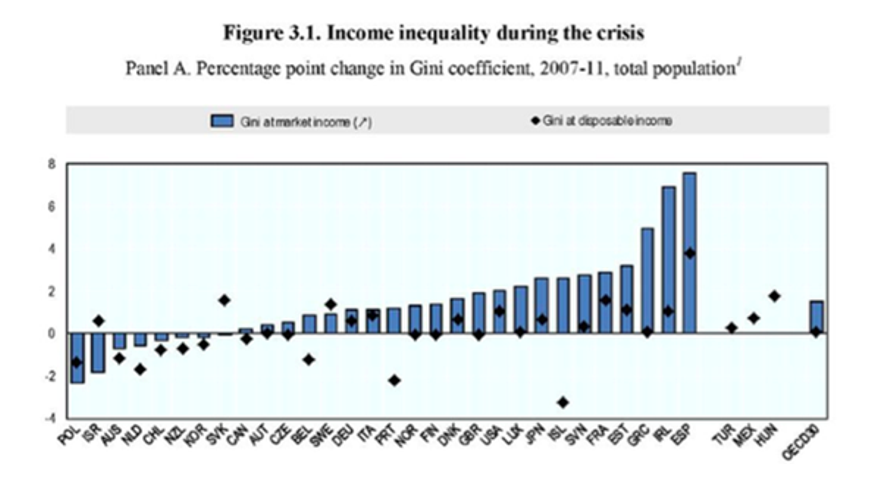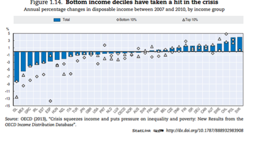 Y, como indica el gráfico 2, España presenta unas alarmantes tasas de pobreza, superando no sólo a Reino Unido, sino a todos los países del este de Europa. Los gráficos 3 y 4, gentileza de un tweet de Álvaro Imbernón, muestran los daños desiguales que ha causado la crisis. En el gráfico 3 podemos ver cómo los efectos de la crisis para el 10% más pobre en relación al 10% más rico en cada uno de los países de la OCDE (sólo para los primeros años de la crisis; asusta pensar qué dirán los datos posteriores).