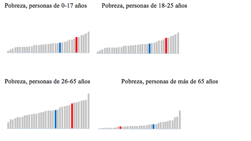 Gráfico 6. Niveles de pobreza por grupos de edades. Media de la OCDE (azul), España (rojo)