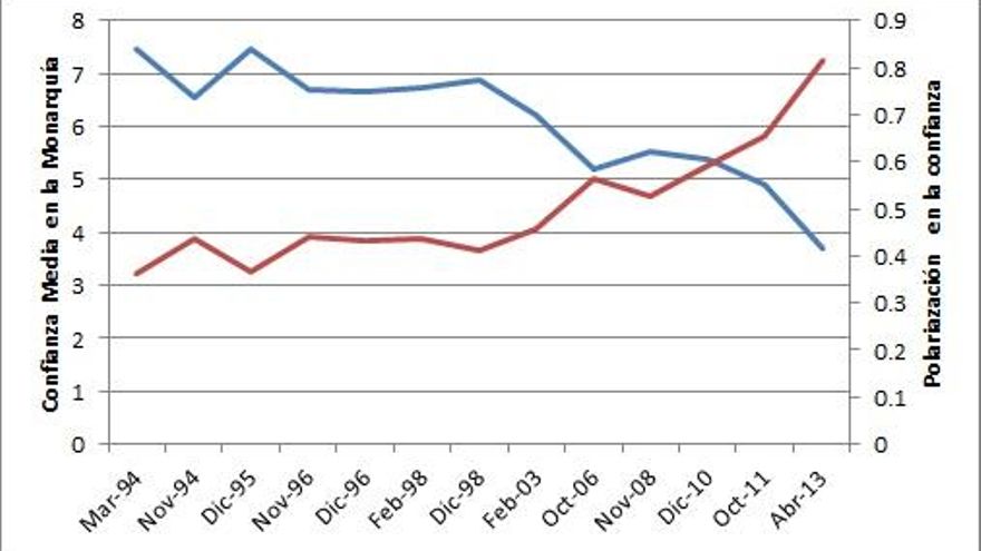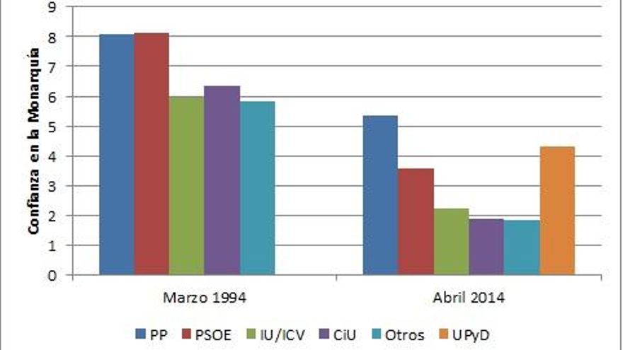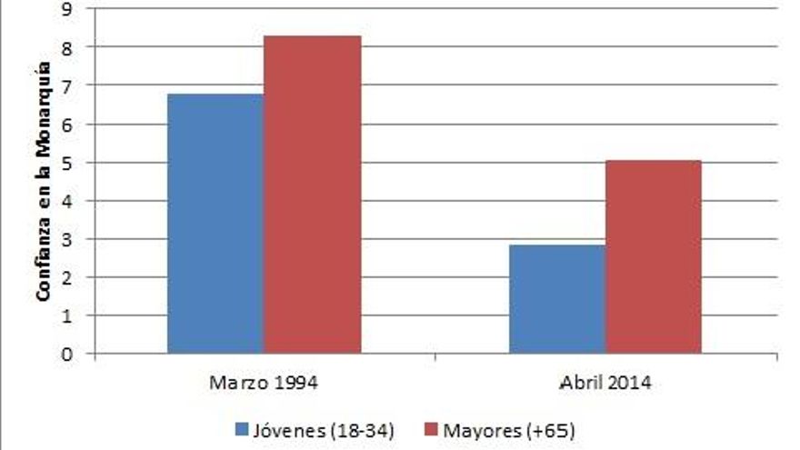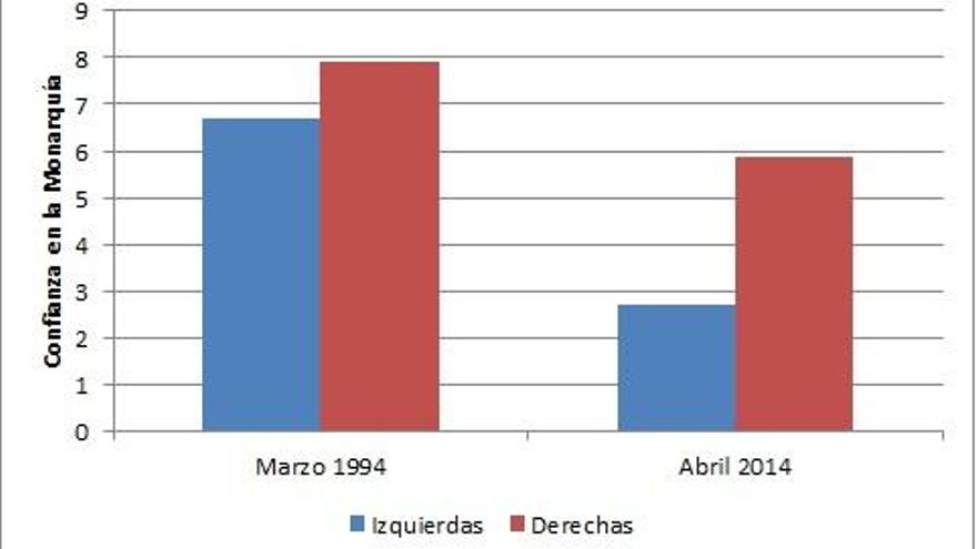 El patrón es claro. En 1994 el apoyo a la Monarquía entendía poco de derechas o izquierdas, edad o partido. El grado de confianza en la Monarquía hace 20 años era alto en todos los grupos. La erosión, en cambio, ha sido muy asimétrica. El rasgo que más destaca es la ideología. En 1994, las diferencia entre ciudadanos de izquierdas (del 1 al 3 en la escala del CIS) y de derechas (7 a 10 en la escala del CIS) era pequeña: 1,2 puntos. Los primeros mostraban una confianza media de 6,7 y los segundos de 7,9. En cambio, veinte años después los ciudadanos de derechas valoran a la Monarquía en 5,87, mientas que la confianza de los ciudadanos de izquierdas es de 2,68. La diferencia casi se ha multiplicado por tres.