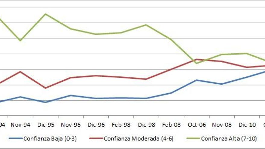 El Rey se va en un momento de alto desprestigio de la Monarquía. A la pregunta de qué grado de confianza la Monarquía le merece en una escala de 0 a 10, los ciudadanos cada vez han ido mostrando niveles menores. El siguiente grafico refleja la evolución de las respuestas en los últimos veinte años. Atrás quedaron los barómetros en que a más de un 65% de españoles la Monarquía les generaba una alta confianza y que para menos de un 10% esta era baja. Los datos del CIS solo alcanzan has 1994, pero probablemente en fechas anteriores los niveles de confianza fueron superiores. La realidad es que la Monarquía gozó de estas simpatías de modo más o menos estable hasta la década de los 2000. A partir del barómetro de febrero de 2003, la opinión de los españoles es de progresivo distanciamiento y desconfianza hasta prácticamente revertir las cifras. Es importante recalcar que la pérdida de complicidad con la Monarquía es previa a los escándalos recientes. La primera caída en la valoración es en la primera mitad de los 2000, bastante antes de que conociéramos los negocios de Urdangarín o las cacerías en África. Tras otro pequeño periodo estable, en los barómetros de 2011 y 2013 (para el último aún no tenemos el dato desglosado), la confianza en la Monarquía vuelve a caer. El resultado es que en abril de 2013, casi la mitad de los españoles tenían una baja confianza en la Monarquía y solo un 18,8% mostraba valores altos.