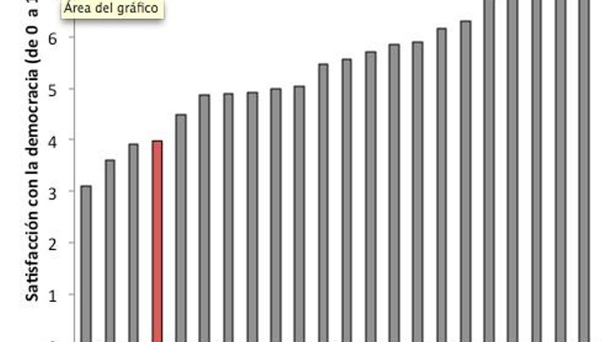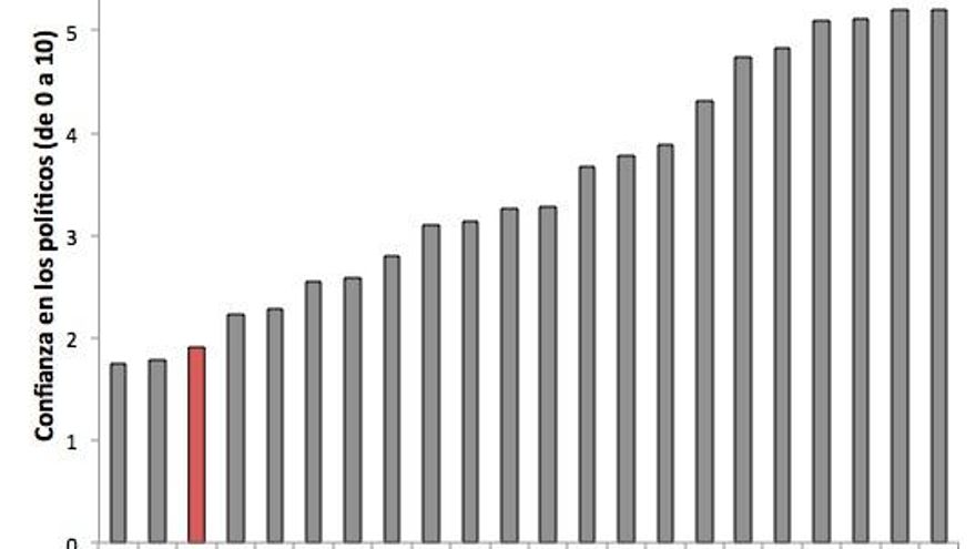 En cambio, existe un aspecto esencial para la democracia en que los ciudadanos españoles manifiestan que el sistema político no cumple sus expectativas: la representación. En aquellas preguntas de la encuesta que tienen que ver con la calidad de la representación política, España puntúa siempre muy bajo. Por ejemplo, España es el país europeo donde más ciudadanos sienten que su gobierno no les escucha. En una escala del 1 al 10, los encuestados valoran hasta qué punto el gobierno de su país cambia sus políticas en concordancia con lo que la mayoría de la ciudadanía prefiere. Somos el único país donde la media no alcanza el 3 (2,97). Si analizamos la confianza en los políticos, los resultados son parecidos. España es el tercer país por la cola en confianza en su clase política, con niveles absolutamente preocupantes.