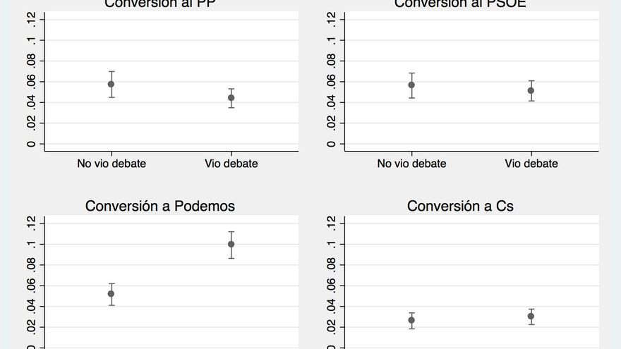 Estos datos hay que tomarlos con cautela. A pesar de que estas relaciones se mantienen cuando uno realiza análisis más sofisticados (inclusión de más controles en la estimación, o el uso de técnicas de “matching” que comparan individuos que vieron el debate con otros iguales que ellos pero que no lo vieron), somos prudentes a la hora de establecer con certidumbre un efecto causal del debate. A pesar de ello, los datos del CIS sí sugieren que en el contexto del 20D los debates pudieron ejercer una influencia en el voto mayor que la que los politólogos solemos atribuirles. Y Podemos fue el partido que más beneficio consiguió sacarles.