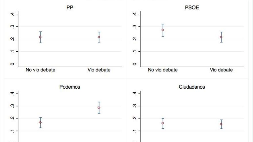Si nos fijamos en los datos en bruto, encontramos algunas diferencias llamativas entre los que vieron y los que no vieron el debate. Entre los que no lo hicieron, un 29% se abstuvieron, un 20% votó al PP, otro 20% votó al PSOE, un 11% votó a Podemos y sus aliados, y un 10% votó a Ciudadanos. Entre los que sí presenciaron el debate, sólo un 10% se abstuvieron, un 22% votó al PP, un 18% al PSOE, un 15% votaron a Ciudadanos, y… ¡un 27%! votaron a Podemos y las confluencias.