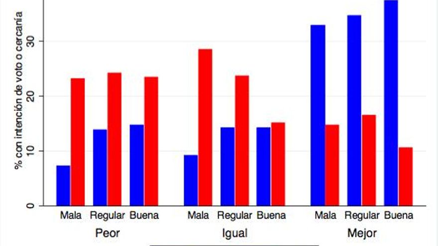 Los gráficos 2 y 3 muestan el porcentaje de entrevistados con intención de votar a cada partido (o que se muestran cercanos a él) en función no sólo de su situación económica personal, sino también de cómo creen ellos que es la situación de la economía española respecto a la de hace un año: mejor (un 22% de los entrevistados lo creen así) igual (un 53%) o peor (un 24%).