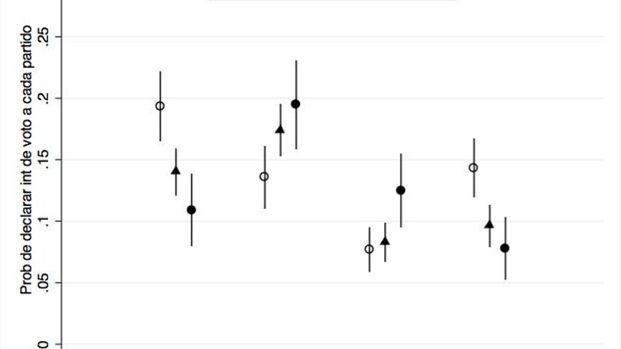 Respecto a la mitad de entrevistados que declaran disfrutar de una situación económica “regular”, atravesar por una situación “buena o muy buena” está asociado a una propensión mayor a votar a PP y a Ciudadanos, y menos al PSOE (la probabilidad de votar a Podemos es también algo más baja, pero como muestran las líneas que muestran los intervalos de confianza, en este caso la diferencia no es significativa). Por su parte, declarar que se está en una situación económica “mala o muy mala” no cambia signifcativamente la probabilidad de votar a ningún partido respecto a aquellos que la juzgan como “regular”, con la excepción de Podemos, que sí experimenta un aumento significativo en intención de voto más cercanía. En resumen, los individuos en situaciones económicas favorables son más propensos a elegir PP y Ciudadanos, y menos al PSOE, y Podemos es más preferido entre aquellos que están en situaciones económicas más desfavorables que entre los que no lo están.