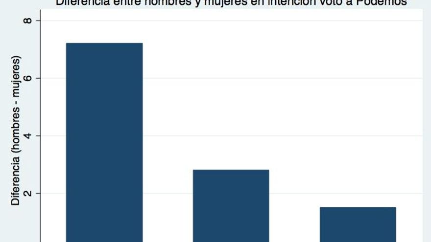 Desde la irrupción de Podemos en 2014, las encuestas mostraban que el perfil del electorado de esta formación tenía un claro sesgo masculino. Según los estudios que disponemos para las elecciones autonómicas de 2015, las mujeres eran menos propensas a votar por las listas de esta jóven formación política. En realidad, este patrón ya tenía lugar antes de la llegada de los nuevos partidos, pues a lo largo de estas más de tres décadas de democracia, las mujeres han sido más proclives a votar a las grandes formaciones (PP y PSOE) y menos partidarias a apoyar a partidos pequeños como IU. Este patrón no se debe a que las mujeres sean más conservadoras o de derechas, pues desde hace muchos años en España la ideología no está relacionado con el sexo. Aún no habiendo una respuesta clara, se ha intentado explicar el sesgo masculino de Podemos aduciendo a argumentos como la mayor aversión al riesgo de las mujeres a apostar abiertamente por nuevas formaciones sin carta de servicios que acredite su solvencia. De hecho, el PSOE del jóven Felipe González de inicios de la década de 1980 también le costó un tiempo atraer el voto femenino. Los datos del CIS parecen indicar que esta brecha de género que caracterizaba el voto a Podemos se está desvaneciendo. En el último barómetro del CIS, las mujeres siguen siendo algo más reacias que los hombres a declarar su voto a Podemos, pero la diferencia es inferior a dos puntos porcentuales y es casi cuatro veces inferior a hace dos años. El tiempo dirá si esta tendencia se consolida, pero, por el momento la tendencia parece avalar la tesis de Carolina Bescansa de que sólo es cuestión de tiempo que las mujeres acaben por sumarse al proyecto de Podemos.