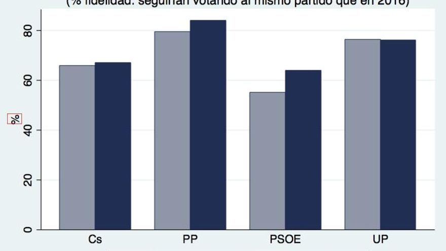 Con todo, los datos del nuevo barómetro del CIS muestran algunos signos algo alentadores para las filas socialistas. Según las estimaciones del CIS, el PSOE es el único partido que mejoraría en intención de voto con respecto al anterior barómetro de octubre. La ligera recuperación del PSOE (de 1,6 puntos) se puede justificar por tres factores: en primer lugar, la tasa de lealtad del PSOE está aumentando (véase gráfico 2): si bien en la encuesta de octubre el Partido Socialista sólo conseguía retener a poco más de la mitad de sus votantes, en enero esta cifra ha ascendido unos ocho puntos porcentuales. Los datos del CIS indican, pues, que los socialistas van recuperando algunos votantes desafectos tras su crisis interna. En segundo lugar, las transferencias del PSOE a Podemos (que ya a estas alturas eran ciertamente modestas) se han reducido a la mitad. Y en tercer lugar, el PSOE está logrando recuperar algunos de sus votantes desmovilizados, que se encontraban refugiados en la indecisión o en la intención de abstenerse. En definitiva, el PSOE, a pesar de sufrir la peor crisis interna de su historia reciente, se mantiene con suficiente fortaleza como para que sus adversarios se tomen en serio su capacidad de dar batalla.