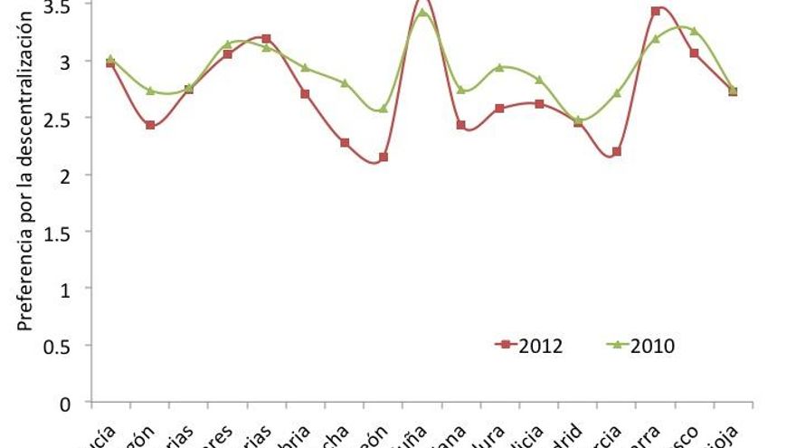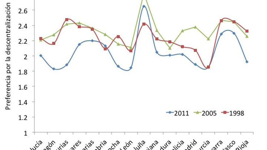 La primera parte de la historia que muestran los resultados es conocida: en el año 2011 se ha producido un giro centralista en los votantes del PSOE como en los del. A pesar de que los votantes socialistas se han vuelto más centralistas, estos siguen siendo más favorables al autogobierno que los votantes del Partido Popular.