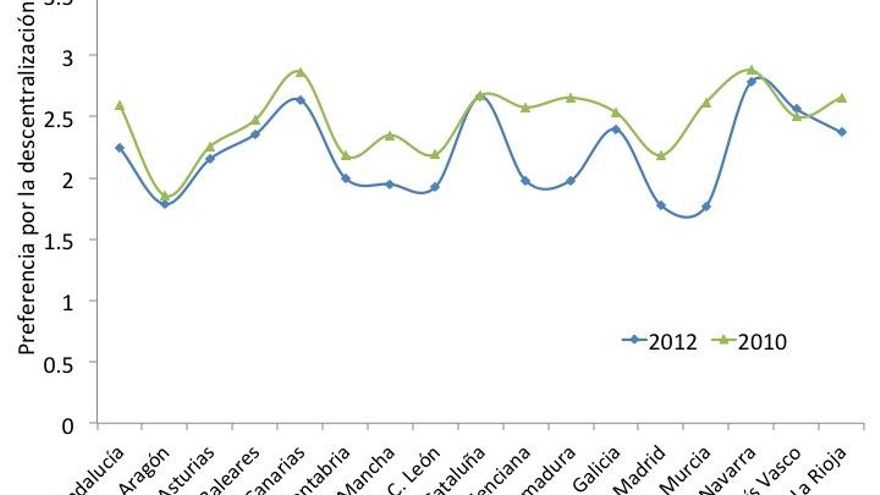 En definitiva, la evolución de la opinión pública española sobre la cuestión territorial parece ir más allá de tan renombrado giro centralista. Primero, porque la centralización ha tenido un impacto desigual entre territorios, lo cual se refleja en la polarización de las posiciones de los votantes de los dos principales partidos nacionales. Segundo, porque los datos del 2012 indican que la heterogeneidad de opiniones sobre la cuestión territorial cada vez afecta más a los votantes del Partido Popular. Posiblemente los próximos desencuentros entre los barones territoriales del PP y la dirección nacional tengan mucho que ver con el creciente divorcio territorial entre sus votantes.