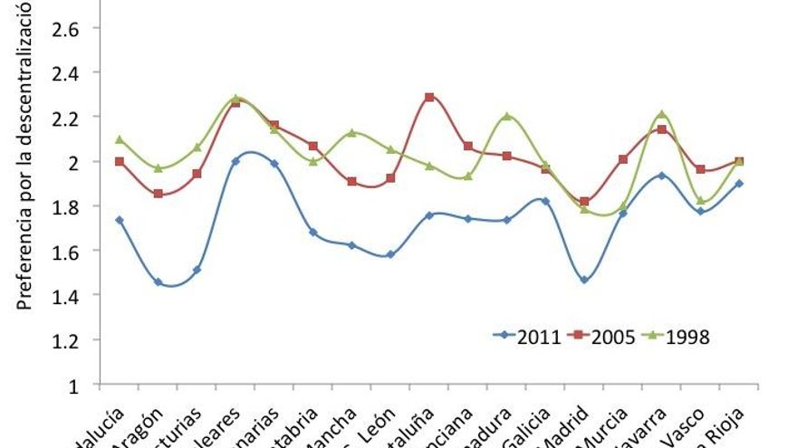 Donde sí parece existir un creciente divorcio entre los ciudadanos es en la cuestión territorial. El aumento del centralismo en la opinión pública es la principal novedad que aparece cuando se agregan los resultados de manera nacional. Sin embargo, ello solo describe una parte de los cambios que se están produciendo. La otra parte tiene que ver con un creciente distanciamiento entre el modelo territorial que prefieren los ciudadanos en unas comunidades autónomas y en otras.
