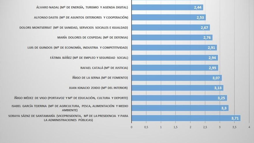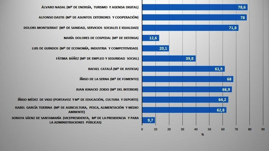 No todos los cambios de ministros realizados por Rajoy han tenido un efecto inmediato positivo. Por ejemplo, Alfonso Dastis (2,53), Dolors Montserrat (2,67) e Íñigo de la Serna (3,07) se han estrenado respectivamente como titulares de las carteras de Exteriores, Igualdad y Fomento con puntuaciones más bajas que con las que acabaron, al final de la X legislatura, sus predecesores en el cargo (José Manuel García-Margallo con un 3,52, Alfonso Alonso con un 3,2 y Ana Pastor con 3,21). En el otro extremo, encontramos a la nueva titular de Defensa, María Dolores de Cospedal, y al nuevo ministro de Interior, Juan Ignacio Zoido, que logran una puntuación más alta que la que tenían respectivamente Pedro Morenés y Jorge Fernández Díaz a finales de 2015.