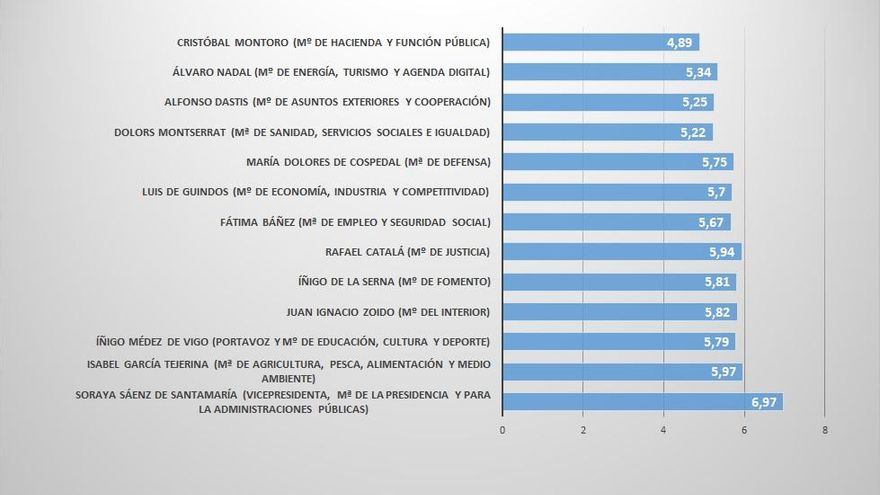 4) Entre los votantes del PP, el único ministro que no obtiene el aprobado es Cristóbal Montoro. Y la persona mejor valorada es la vicepresidenta, Soraya Sáenz de Santamaría.