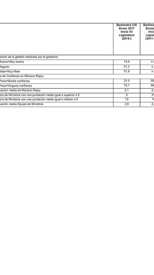 Ahora, al inicio de su segundo mandato, Rajoy parte de una puntuación media de 3,1 y suscita desconfianza al 75,7% de la población. En los últimos meses, y tras haber formado gobierno, la imagen de Rajoy ha mejorado ligeramente, pues a principios del pasado octubre recibía una puntuación inferior a 3. Particularmente, Rajoy se ha reforzado entre los votantes del PP quienes ahora le puntúan casi tan alto como al principio de su primer mandato. Además, el líder del PP obtiene una mejor valoración entre sus votantes, que la que logra Javier Fernández entre los electores socialistas (5,11), Pablo Iglesias entre los votantes de Podemos (6,33), y Albert Rivera entre los electores de Ciudadanos (6,21).