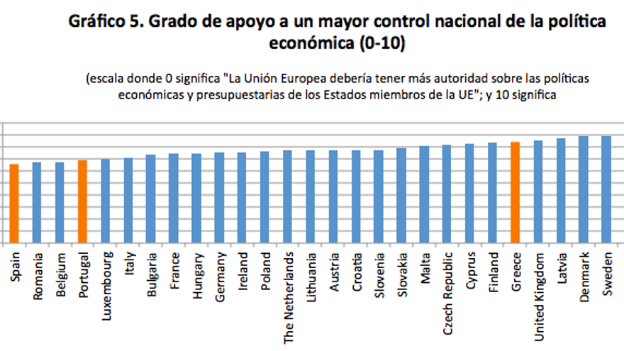 Probablemente las diferencias más llamativas son las que tienen que ver con la valoración del grado de autoridad que debe tener la UE sobre las políticas económicas nacionales. Los españoles y portugueses son, del conjunto de la Unión Europea, quienes se muestran más convencidos de que las instituciones europeas deben tener más autoridad sobre las políticas económicas y presupuestarias de los Estados miembros, mientras que los griegos son más favorables a mantener el control nacional sobre estas políticas (gráfico 5).