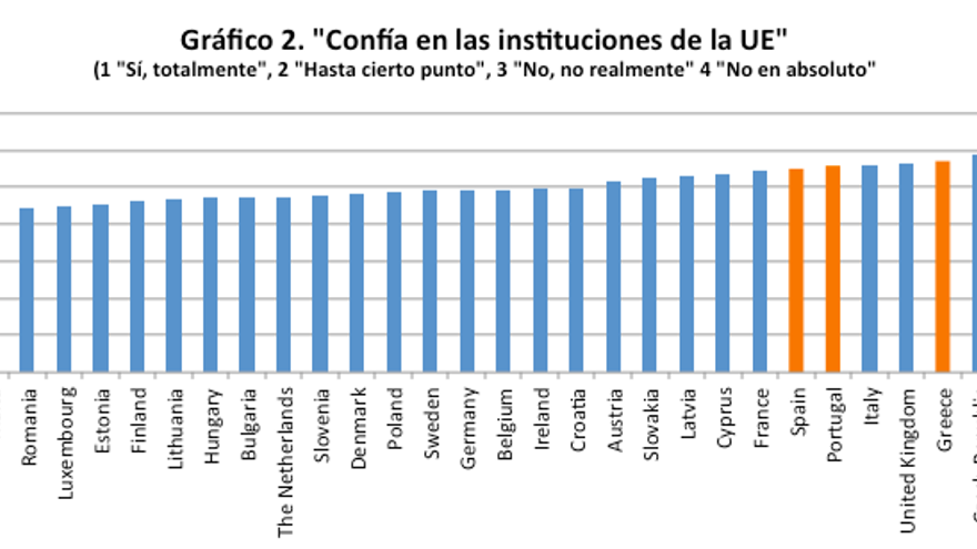Españoles, portugueses y griegos van claramente de la mano en su querencia por la redistribución entre ricos y pobres. De acuerdo con los datos del último European Election Study (encuesta realizada tras las últimas elecciones al Parlamento Europeo) los ciudadanos de estos tres países son los más favorables a que se redistribuya la riqueza dentro de su país (gráfico 1). El dato no sorprende si se tiene en cuenta que los tres países están a la cabeza en niveles de desigualdad en el conjunto de la Unión Europea. El segundo aspecto en el que coinciden es en su falta de confianza en las instituciones europeas. Como muestra el gráfico 2, los ciudadanos de Grecia, España y Portugal son tan desconfiados como lo son en el país menos europeísta por antonomasia: el Reino Unido. La opinión de los tres países sureños es igual de mala (y entre las peores de Europa) sobre el Parlamento Europeo.