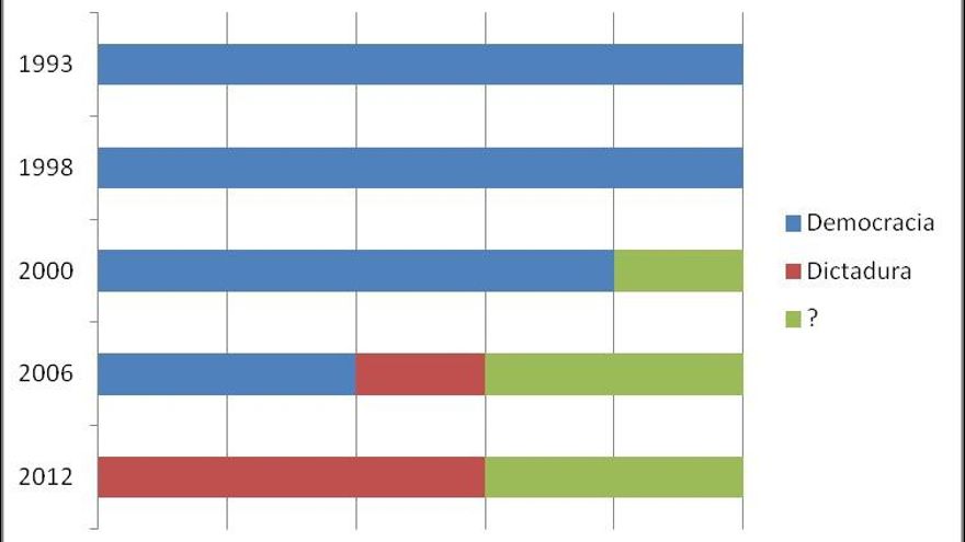 Mirando cinco medidas de regímenes políticos en el mundo en los últimos 20 años, vemos que Venezuela puede ser catalogada como una democracia fundamentalmente antes de la llegada de Chávez al poder y en los primeros años de su mandato. No obstante, a partir del cambio constitucional existen incertidumbres que justifican las dudas respecto a si Venezuela es o no una democracia. De acuerdo a algunas medidas, en la última mitad de los catorce años de gobierno de Chávez Venezuela ya puede ser clasificada como una dictadura.