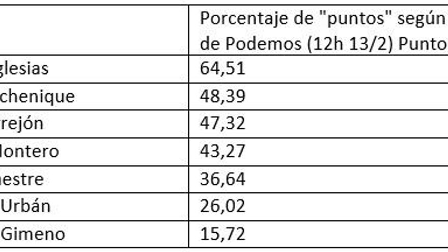 Esta mañana la página web de Podemos incluía una cifra que llama “porcentaje de puntos” junto a los electos, pero que no es sino el porcentaje calculado a partir del número que resulta de dividir sus puntos entre 80; es decir, el número de papeletas que contendrían ese nombre, expresado como fracción del número de votos válidos, si ese nombre fuera siempre el primero de las papeleta. Ese sería el porcentaje máximo de votantes que habrían podido poner a cada candidato en primera posición dado el número total de puntos obtenidos por cada uno de los candidatos. Obviamente sus puntos no proceden solo de aquellas papeletas en las que aparecían en primera posición, sino de múltiples combinaciones de diferentes posiciones. Pero esta tabla nos permite una comparación de la cantidad de apoyos recibidos por cada uno sobre una misma métrica. (Es de lamentar que esto no esté explicado, de momento, en la información ofrecida por Podemos en su página web.)