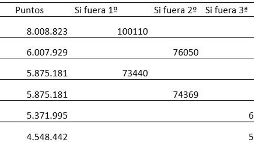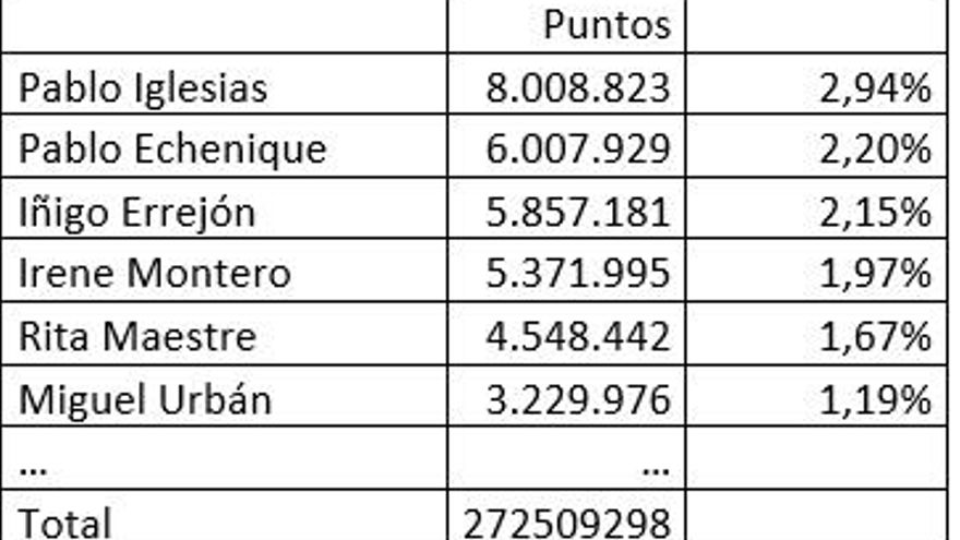 Como cálculo del total de votos, lo anterior es verosímil para Pablo Iglesias, que es posible que casi siempre haya sido el primero de quienes le han votado. Se podría afinar la aproximación para otros candidatos, mientras no tengamos los votos, suponiendo que algunos de estos nombres estarán casi siempre en las posiciones segundas y terceras (y tendrán, por tanto, menos puntos por cada voto).