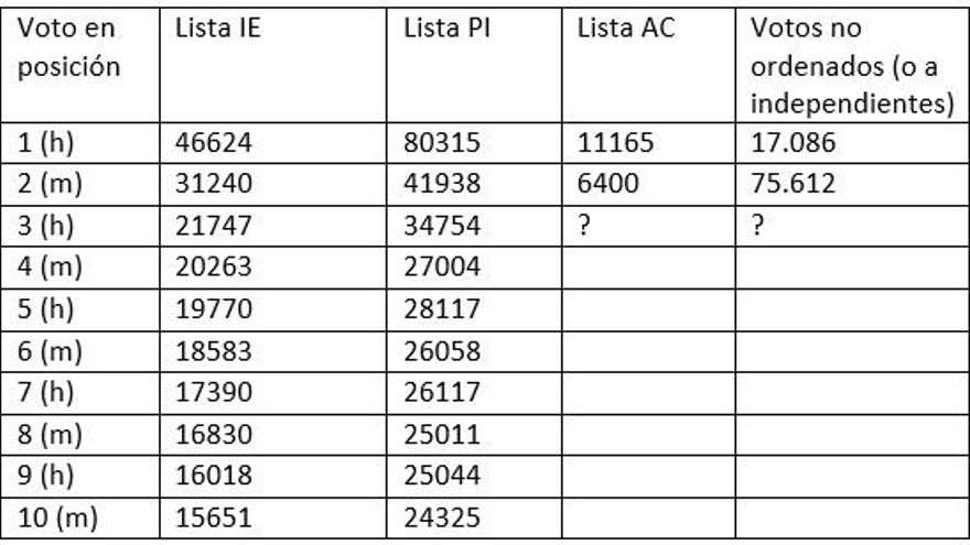 La tabla 7 muestra los votos en posición “modal” de cada candidato, que coincide con su posición en la lista (los votos que Errejón sacó de como primero de lista, los votos que Montero obtuvo como segunda de lista, los votos de Navarro como tercero...) Esto da una idea de la fuerza de arrastre de las listas y su orden.