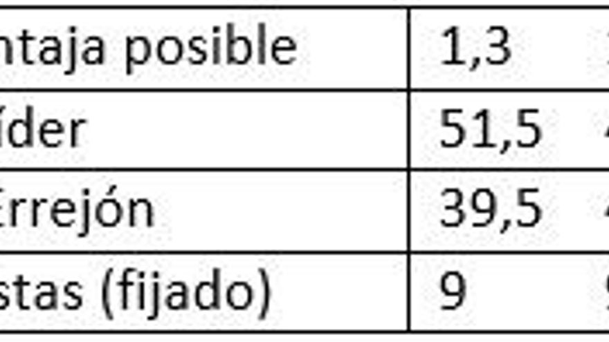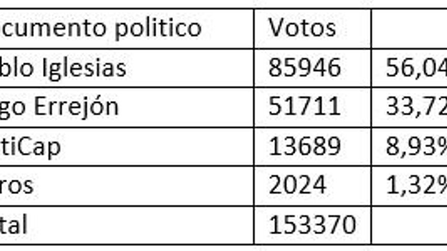 Contra estos números es posible esgrimir que la distribución de apoyos para el documento político, que se cuenta en votos y no en los dichosos puntos, da una respuesta más cabal de la pregunta que nos estamos haciendo. Esto nos llevaría a pensar en que la ventaja de la tendencia ganadora con respecto a la de Errejón es de 1,66 a 1 (es un 66% mayor), incluso mayor que la que se cuenta en los puntos totales a las listas.