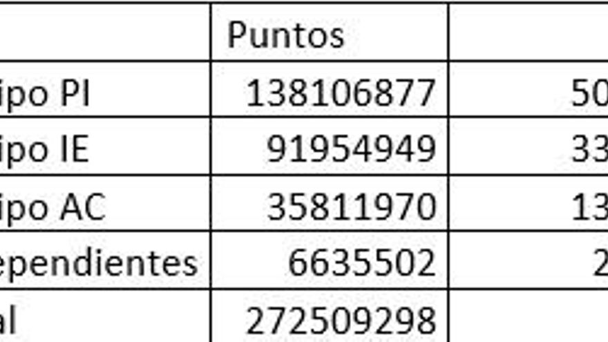 Cada votante en el proceso de participación de Podemos podía repartir hasta 3.069 puntos entre 62 candidatos, con un máximo de 80 para el primero y un mínimo de 19 para el sexagésimo segundo de su lista. Los 155.190 votantes (válidos) de Vistalegre II podían repartir casi quinientos millones de puntos (476.278.110). Se han repartido el 57% de ellos (272.509.298), indicando que muchos votantes no han agotado sus opciones, y han confeccionado listas con menos de 62 candidatos. El votante promedio, de hecho, marcó entre 24 y 25 nombres en su papeleta (medio es medio, unos marcarían 62 y otros solo 2). Son cosas del endiablado sistema de participación que se propuso.