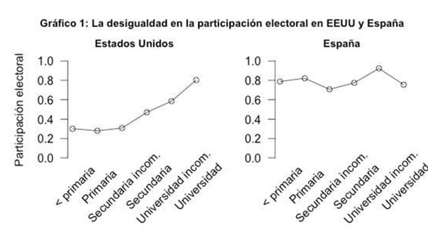 Sin embargo, en España, como en otros contextos, la proposición que los privilegiados votan más simplemente no es cierta. El siguiente gráfico muestra la participación electoral según el nivel educativo (uno de los principales indicadores del estatus socio-económico) con datos del Estudios Comparado de Sistemas Electorales para las elecciones de 2004 en EEUU y España. En EEUU sólo una de cada tres personas con educación primaria o menos vota en las elecciones presidenciales, mientras que cuatro de cada cinco personas con educación universitaria vota. En España, por el contrario, no existen diferencias significativas en la participación electoral según el nivel educativo. Este resultado se repite una y otra vez usando otros datos y mirando otras elecciones.