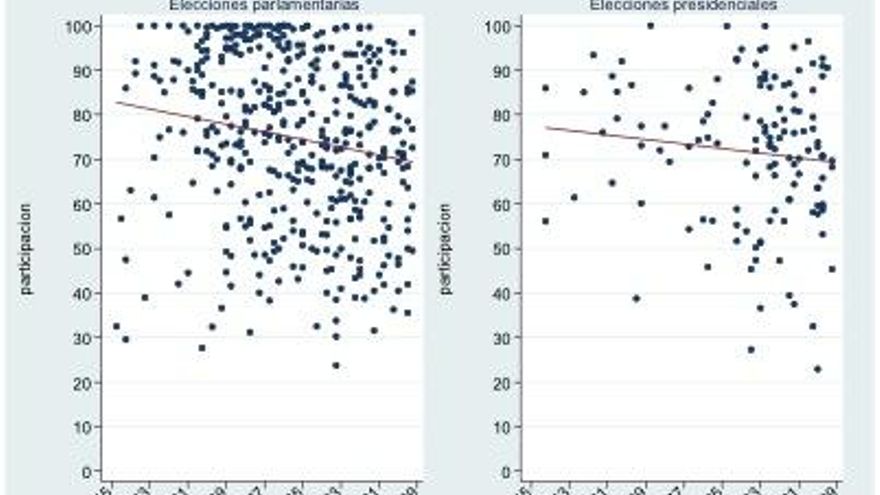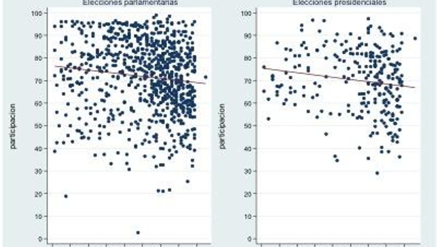 Cada punto del gráfico es la participación en un país y año concreto. Además de ver cómo aumenta el número de países con el paso del tiempo, también se observa cómo votar, incluso en dictaduras, se produce en altos niveles. Los datos recogen para 277 elecciones parlamentarias y 121 presidenciales en dictaduras y recogen lo que el profesor Andreas Schedler llama autoritarismo electoral. El promedio de la participación en dictaduras es de alrededor del 70% y es algo mayor en elecciones parlamentarias que en presidenciales. No sorprende ver una participación del casi 100% en Bulgaria en 1981 o del 96% en 2004 en Guinea Ecuatorial. Pero también hay valores bajos, como Ghana en 1992 donde no se llega al 24% o El Salvador en 1964, por debajo del 28%. Como se ve, estas tasas también van asociadas con la capacidad coercitiva de los propios estados o con el tipo de dictadura.