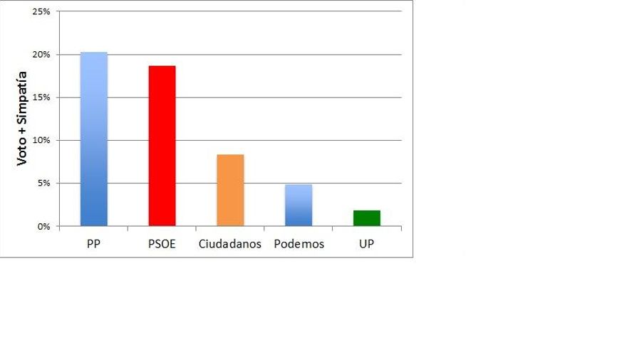 Por último, ¿qué ocurre con aquellos que no tienen interés por la política? Aquí la expectativa sería más bien que estos votantes son menos receptivos a las opciones nuevas, en parte porque desconocen los detalles de su oferta política. Esto queda confirmado en el siguiente gráfico en que muestro el Voto+Simpatía de aquellos que dicen estar nada interesados por la política. Como se ve, son votantes fundamentalmente del PP, y en nivel parecido, del PSOE. Los niveles de afiliación son mayores que para los grupos analizados anteriormente, lo que muestra que estos votantes, por el hecho de no estar informados, no son necesariamente los menos movilizados. Lo que sí que parece evidente es que son menos receptivos a las fuerzas emergentes y, probablemente, más desconocedores de estas. Esto podría deberse a que estos votantes son, en general, de mayor edad que la media electoral. Aunque esto es en parte cierto, no explica la relación que observamos. Cuando miramos (no mostrado aquí) Voto+Simpatía entre los votantes sin interés por la política menores de 35 años, el PSOE es la opción preferida, seguido de PP, que baja bastante en intención de voto, pero todavía supera por tres puntos tanto a Ciudadanos como Podemos. Es decir, entre los jóvenes sin interés por la política, PP y PSOE siguen siendo las opciones más apoyadas.