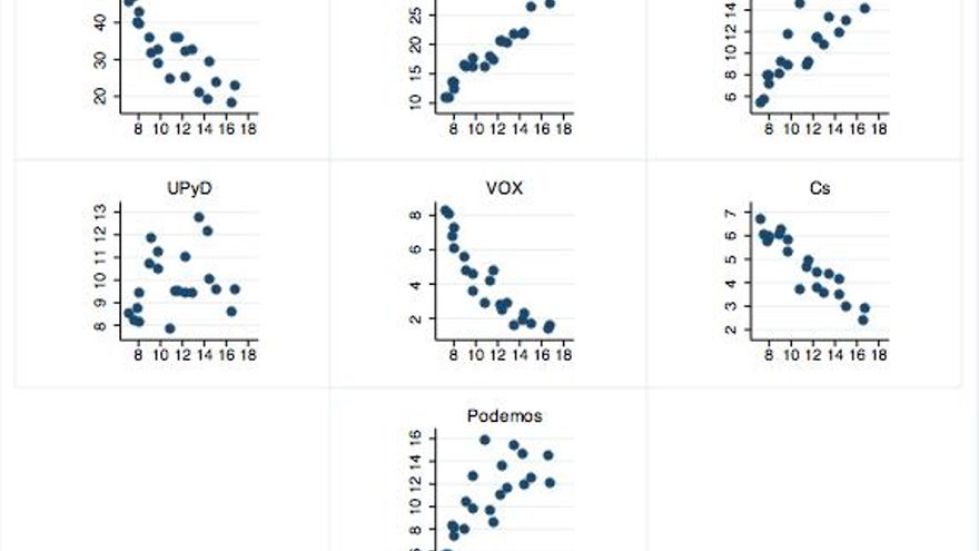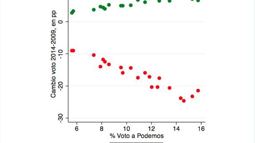El voto a Podemos es el que esta más relacionado con un aumento de la participación (o el que más sufre cuando la participación cae). La correlación es muy fuerte: 0.8. Cada punto de incremento de participación respecto a 2009 está asociado a un aumento de más de un punto en el porcentaje de voto obtenido por Podemos. En contraste, Ciudadanos, Vox, y sobre todo, PP, tienen resultados mejores en aquellos lugares en donde la participación cae más. Por supuesto esto no quiere decir que todos los votantes de Podemos eran todos potenciales abstencionistas, pero el que la relación a nivel agregado entre la evolución de la participación y el voto a Podemos sea tan fuerte sí sugiere que Podemos ha logrado representar a sectores políticamente apáticos que no encontraban acomodo en las fuerzas políticas existentes.