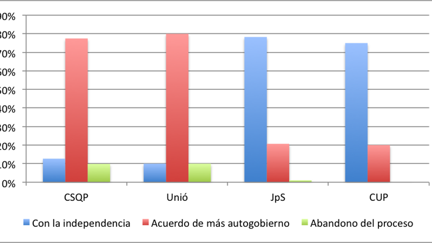 En conclusión, pare leer los resultados del 27S podemos jugar con la indefinición de CSQEP y Unió al no querer ser incluidos como parte del “No”. Esto puede obedecer a sus criterios políticos y estratégicos. Pero el argumento de que un porcentaje importante de sus votantes están por la independencia, no parece ser cierto. Si miramos a sus electorados, es difícil catalogarlos como favorables a la independencia. Al menos no en una proporción muy distinta de los votantes de los partidos del Sí que preferirían un desenlace sin Cataluña independiente.