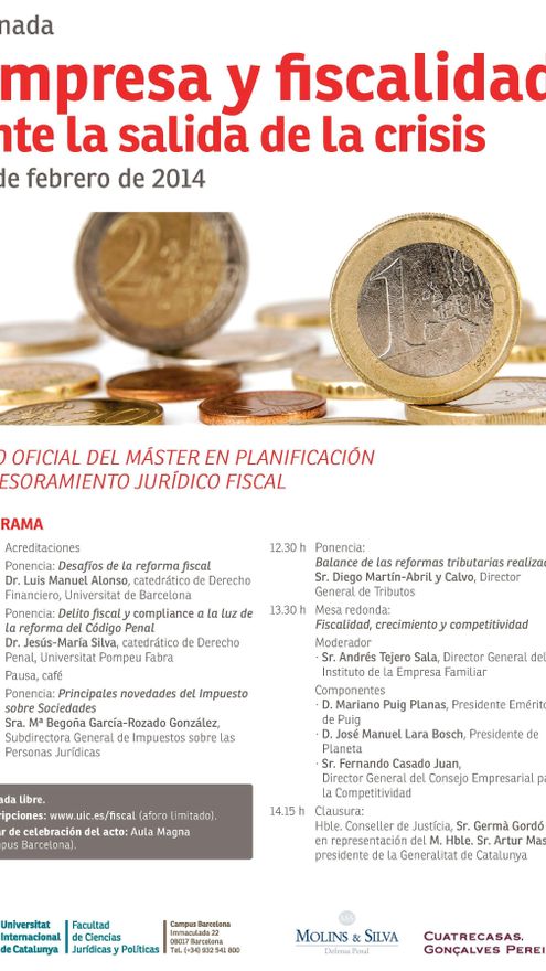 “Empresa y fiscalidad ante la salida de la crisis” es el nombre de las jornadas, organizadas por la Universidad Internacional de Cataluña y dos bufetes de abogados -uno de ellos el que defiende a Cristina de Borbón en el caso Nóos-, a las que fueron invitados el director general de Tributos, Diego Martín-Abril, y la subdirectora general de Impuestos sobre las Personas Jurídicas, Begoña García-Rozado. La fecha de celebración es el miércoles 12, solo tres días después de que la hija del rey declare como imputada ante el juez Castro por blanqueo de dinero y delito fiscal.