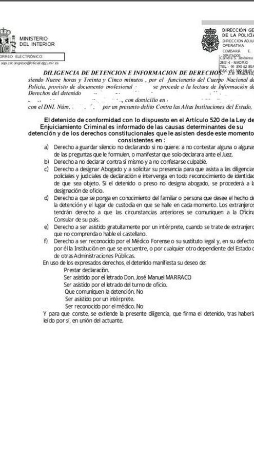 Los interrogatorios han comenzado a las siete y media de la tarde. Hasta entonces, los arrestados han permanecido en dependencias de la Brigada de Información del complejo policial de Moratalaz. El diario.es ha tenido acceso a las diligencias de detención de una de las personas arrestadas. El documento especifica que será acusada de un delito contra las instituciones del Estado.