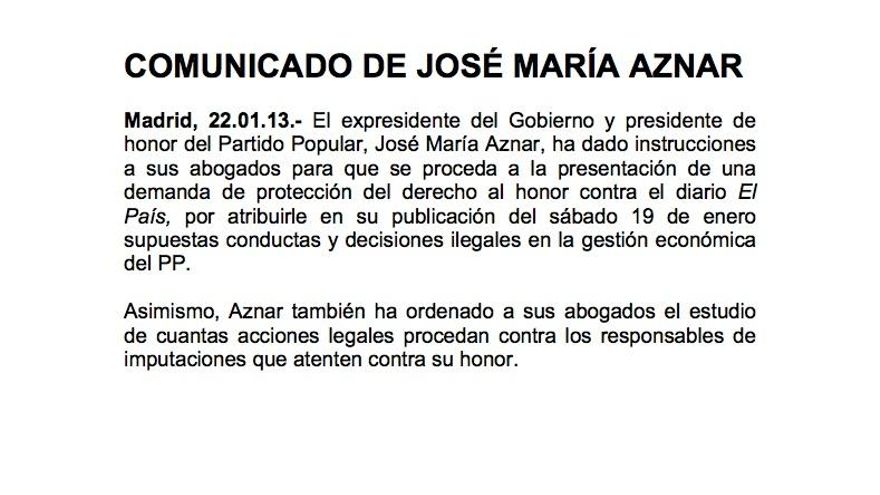 El expresidente del Gobierno José María Aznar ha anunciado a través de un comunicado que “ha dado intrucciones a sus abogados para que se proceda a la presentación de una demanda de protección del derecho al honor contra el diario 'El País”.
