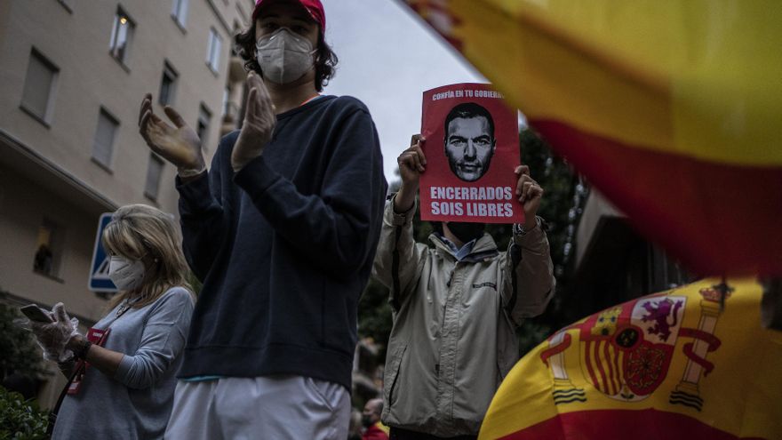 La negativa del Ejecutivo, presentada por la presidenta madrileña, Isabel Díaz Ayuso, como una estrategia de PSOE y Unidas Podemos para provocar la “ruina” de la región, extendió esas protestas a otras zonas. Las convocatorias se multiplicaron por las aplicaciones de mensajería y las redes sociales contra “la gestión sanitaria y económica” del Ejecutivo. Algunos de esos mensajes para movilizar recomiendan qué llevar a la protesta: mascarilla, bandera de España y elementos para hacer ruido.