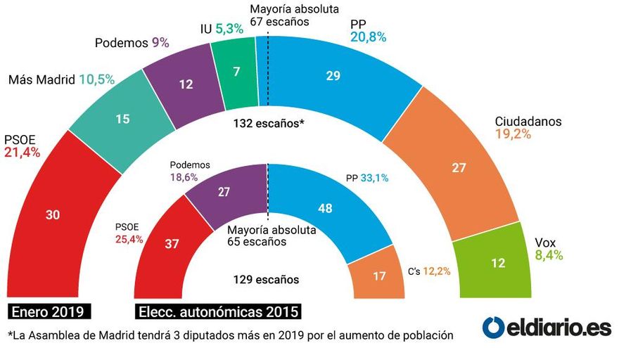 Según los datos de Celeste-Tel, El Partido Socialista obtendrá el 21,4% de los sufragios y 30 escaños. Le sigue el Partido Popular, que perdería su hegemonía en la Comunidad cayendo hasta el 20,8% y dejándose en el camino casi 20 escaños. El sondeo otorga esta formación la posibilidad de obtener 29 escaños, frente a los 48 de los que disfruta en la actualidad. Ciudadanos crece en la tercera posición con el 19,2% de los votos y 27 escaños. Vox irrumpe con fuerza: 8,4% de los votos y 12 escaños. Al igual que sucedió en Andalucía, el PP necesitará a Ciudadanos y Vox si se quiere mantener en el Gobierno.