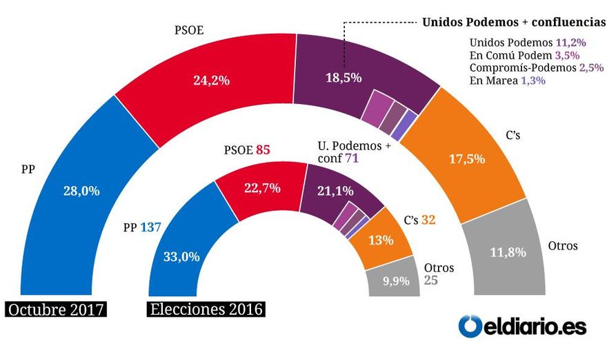 La crisis en Catalunya dispara las expectativas electorales de Ciudadanos. El partido de Albert Rivera crece tres puntos, según el último barómetro del CIS, y se sitúa en el 17,5% de los votos. PP y PSOE se mantienen prácticamente igual que hace tres meses, con un 28% de los sufragios y un 24,2%, respectivamente. Unidos Podemos es el que más desgaste sufre: cae al 18,5%.