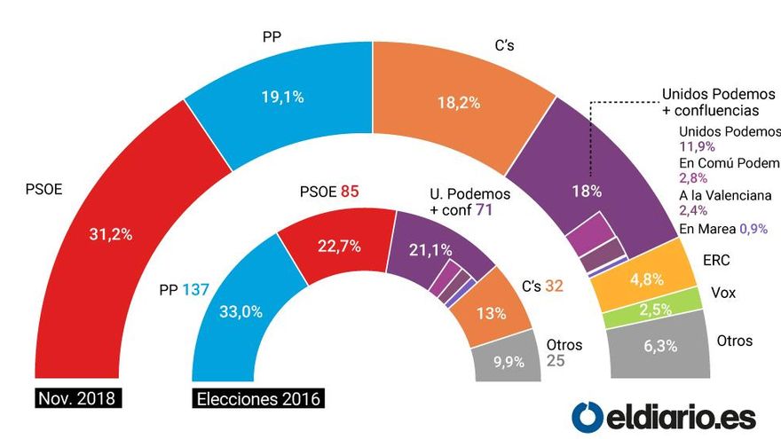 El CIS insiste en situar al PSOE de Pedro Sánchez en primera posición destacada con un 31,2% de los votos y a gran distancia del resto de formaciones. Así lo señala el barómetro de noviembre del Centro de Investigaciones Sociológicas, en el que el único cambio significativo es la vuelta del PP a la segunda posición con el 19,2% de los apoyos, seguido por Ciudadanos con el 18,2%. La suma de Unidos Podemos y sus confluencias quedaría situada en cuarta posición con el 18% de los apoyos.