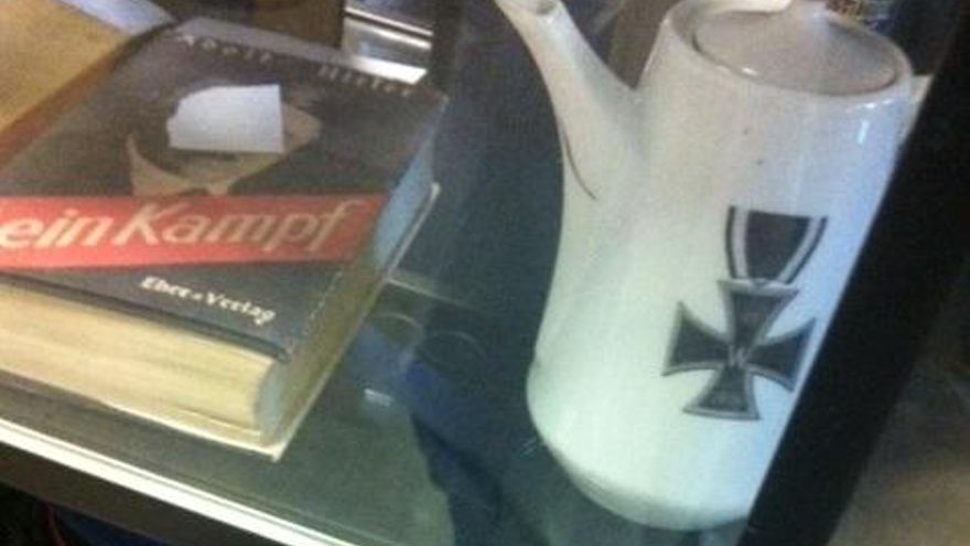 “Solo vendo por coleccionismo”, se lee subrayado en el folio. La hoja pende de una vitrina con antigüedades bélicas alemanas en la feria No sólo Militaria, celebrada este fin de semana en el Pabellón de Convenciones de la Casa de Campo de Madrid. Tras el cristal se ve una gorra de oficial nazi. La esvástica está tapada con cinta americana. También la cara de Hitler en la portada de un ejemplar de Mein Kämpf está cubierta.