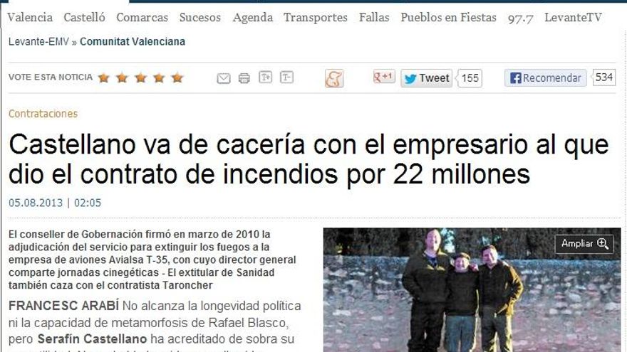 • Según una información publicada por el Levante-EMV, el conseller de Gobernación, Serafín Castellano, compartió jornadas de caza con el director general de la empresa a la que adjudicó el contrato de 22 millones de euros del servicio de extinción de fuegos
