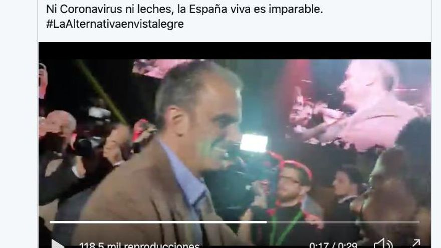 “Ni coronavirus ni leches, la España viva es imparable”, tuiteó el día del mitin un militante de Vox muy activo en redes con un vídeo en el que Ortega Smith y otros dirigentes saludaban eufóricos a todos. Menuda leche les dio el pequeño pero imparable coronavirus. El partido decidió que sus 52 diputados se quedaran en casa, lo que obligó al Congreso a suspender toda su actividad durante una semana.