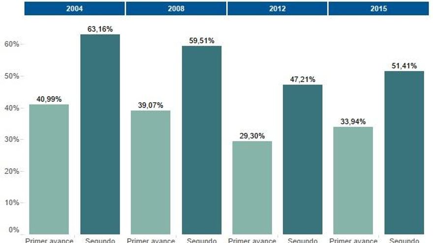 La simultaneidad de comicios autonómicos y generales siempre ha ofrecido mejores índices de participación. La tendencia de participación a la baja en unas elecciones en solitario no se rompe, a pesar de que se trata de una cita electoral en la que confluyen nuevas fuerzas políticas como Podemos o Ciudadanos y en la que la actual presidenta de la Junta, Susana Díaz, que parte como favorita en los sondeos, se pone a disposición de los ciudadanos por primera vez para revalidar su mandato.