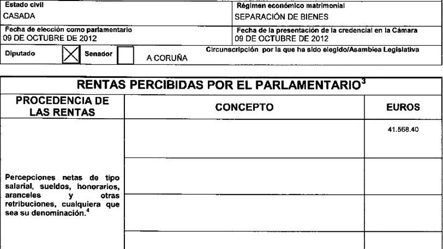 La declaración de quien fuera candidato del PP a la alcaldía de A Coruña es singular porque en ella se incluye una especie de confesión. El diputado popular rellena el documento que el Congreso pone a su disposición ofreciendo todo lujo de detalles: 5 viviendas, 3 garajes y 16 fincas (que le reportan más de 45.000 euros por la venta de madera).